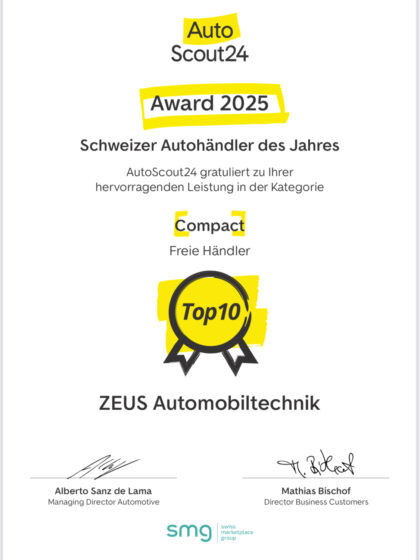 Zeus Automobiltechnik wurde von AutoScout24 für hervorragende Leistung, Qualität und aussergewöhnliche Kundenzufriedenheit ausgezeichnet. Diese Anerkennung bestätigt, wofür wir jeden Tag arbeiten: ehrliche Beratung, saubere Arbeit und zufriedene Kunden.